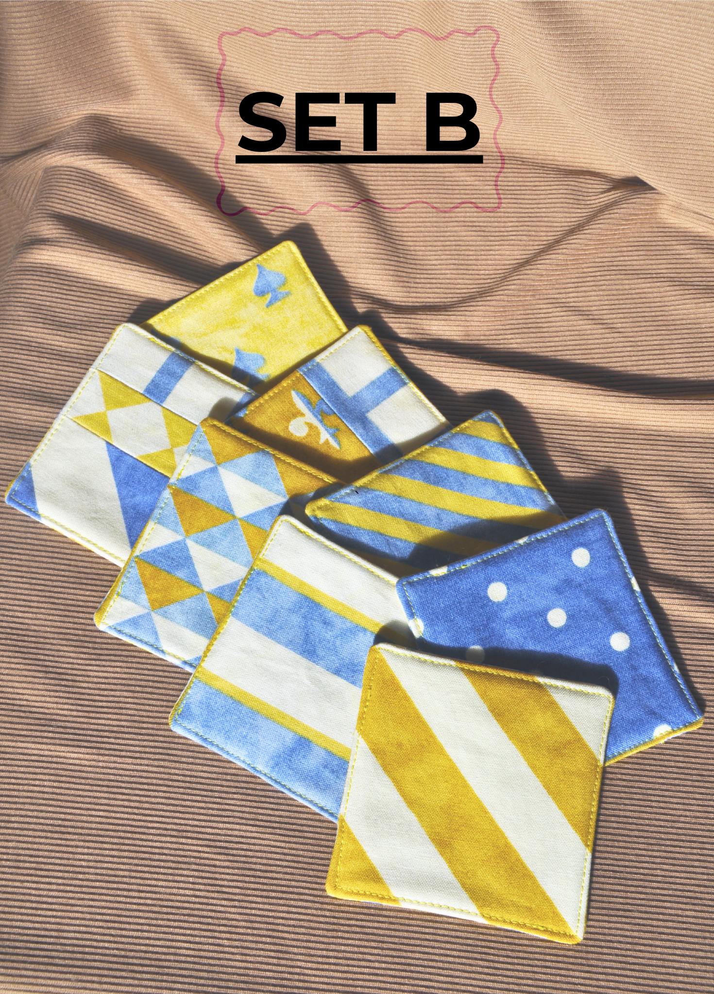 Say goodbye to boring coasters and hello to conversation starters with this one-of-a-kind set of handmade coasters (only 2 completely unique sets available). Carefully crafted from reclaimed cotton fabrics in retro yellow and blue tones, each coaster is a little work of art: sustainable, functional, and full of character.